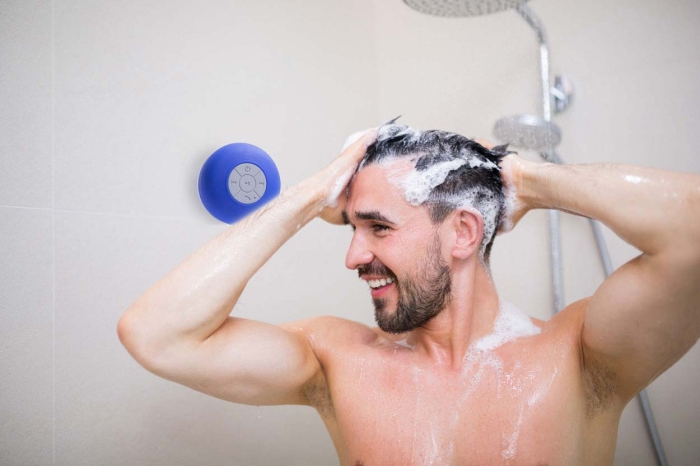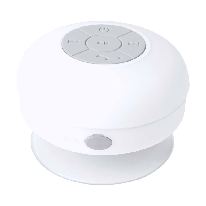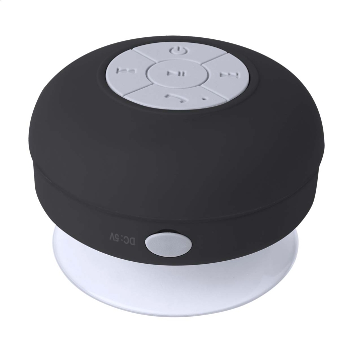 Art. AP852026 Cassa wireless con alloggiamento rivestito in gomma e ampia ventosa. Con funzione di chiamata in vivavoce e batteria ricaricabile integrata. Cavo di ricarica USB incluso.
