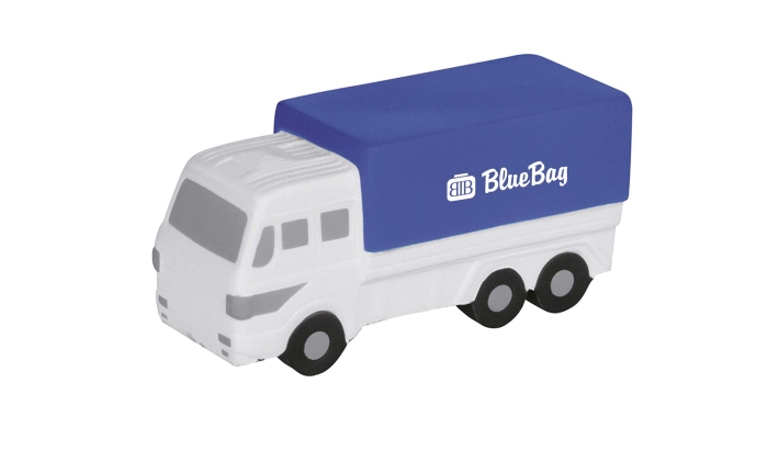 Art. PB37349 Antistress a forma di Camion, realizzato in morbido PU. Personalizzabile con stampa digitale per colori vividi, o con stampa tampografica a un colore.