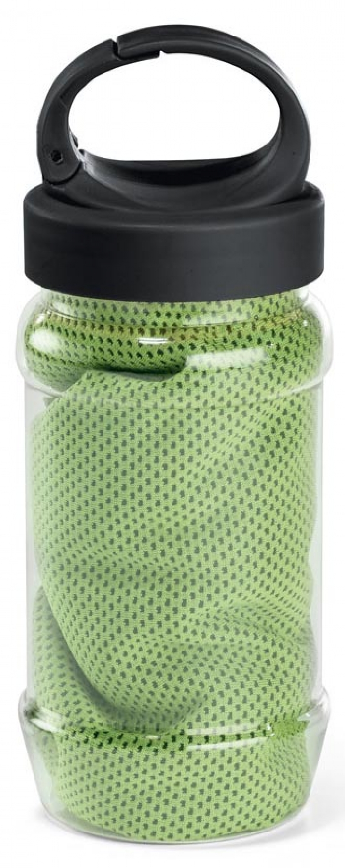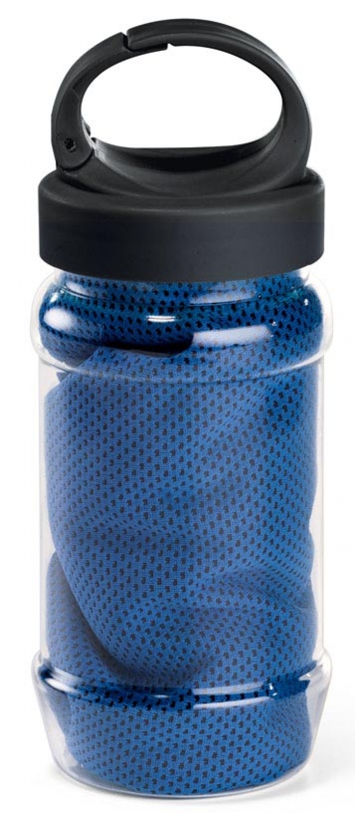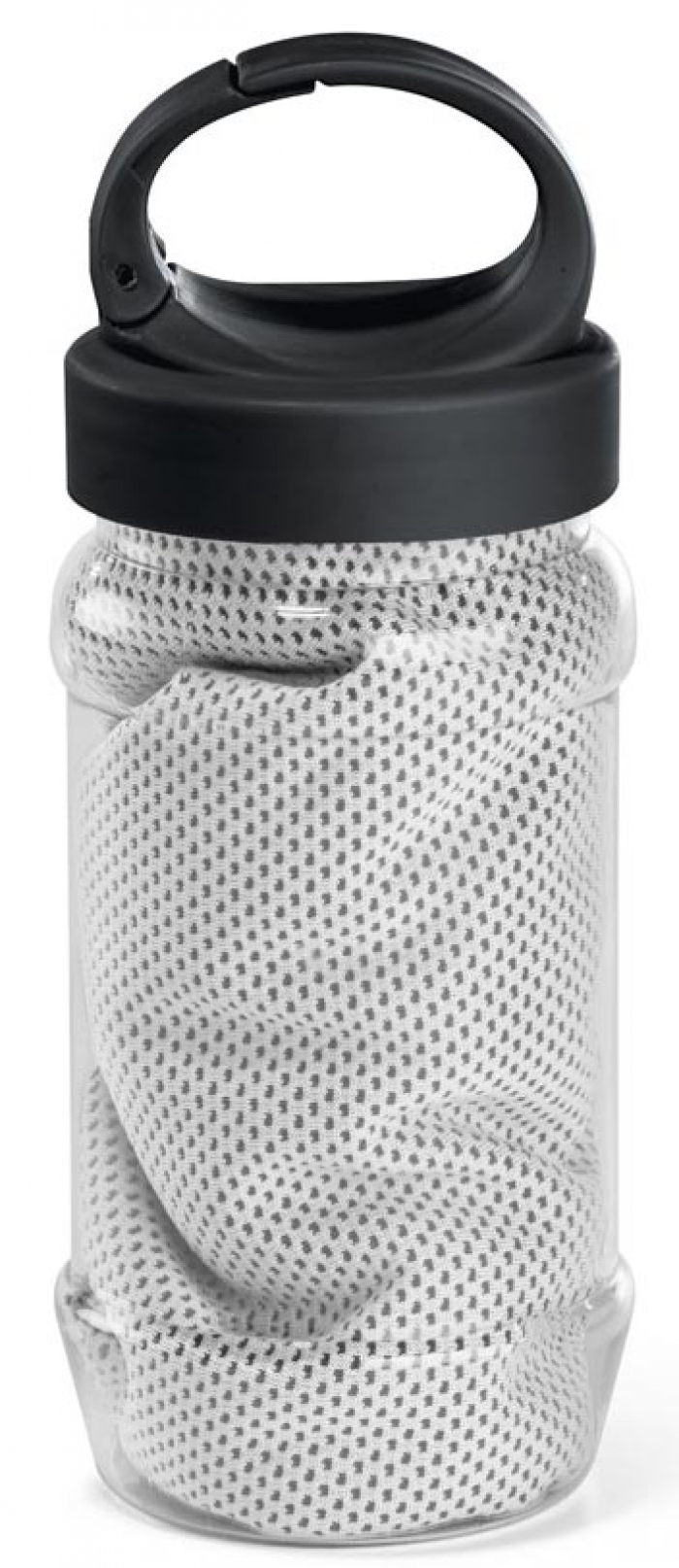 Art. HD166U Borraccia in PP e PET e asciugamano sportivo in poliammide e poliestere. Bottiglia dotata di gancio, per portarla ovunque. Capacità di 440 ml. Asciugamano rinfrescante, da bagnato rimane freddo per qualche ora. Asciugamano riutilizzabile, lavabile in lavatrice.