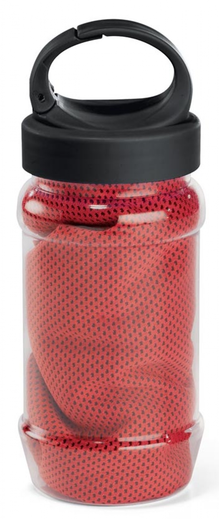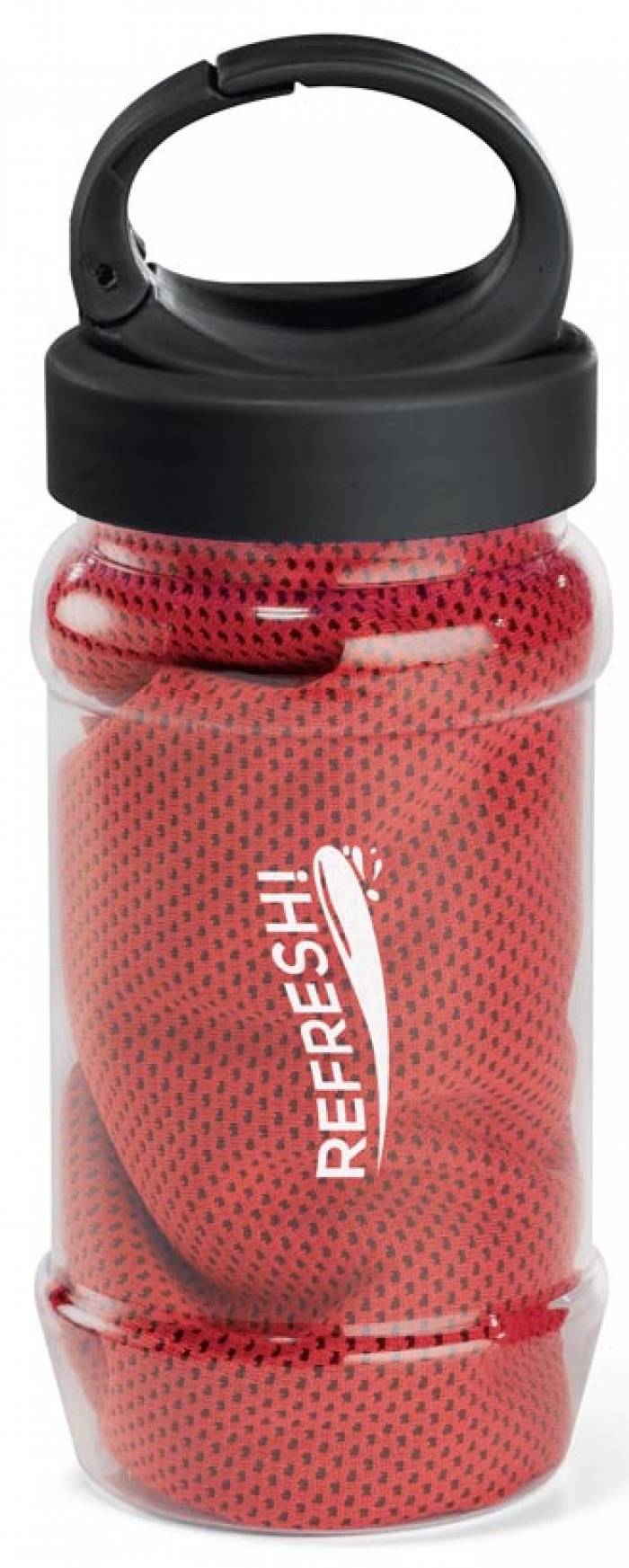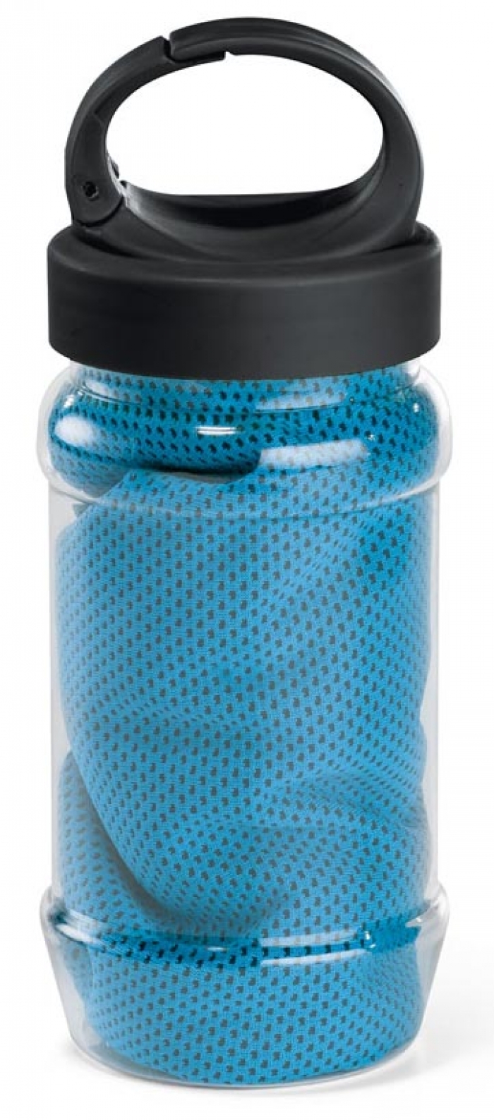 Art. HD166U Borraccia in PP e PET e asciugamano sportivo in poliammide e poliestere. Bottiglia dotata di gancio, per portarla ovunque. Capacità di 440 ml. Asciugamano rinfrescante, da bagnato rimane freddo per qualche ora. Asciugamano riutilizzabile, lavabile in lavatrice.
