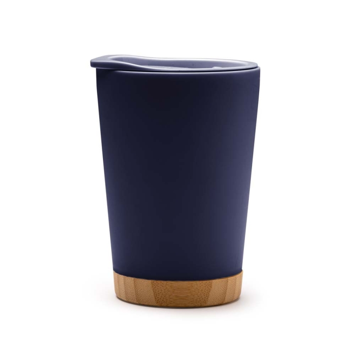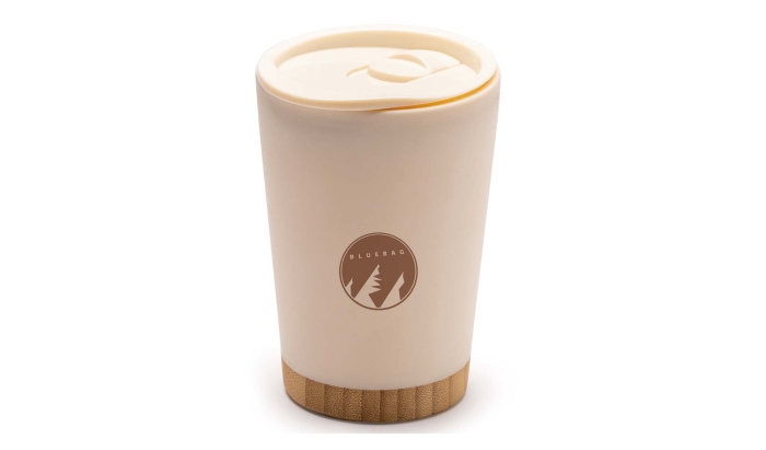 Art. ST2797 Bicchierino doppia parete in materiali riciclati, corpo in PP riciclato e base in bambù. Include un coperchio. Capacità: 290 ml. Confezione in scatola con design ecologico.
