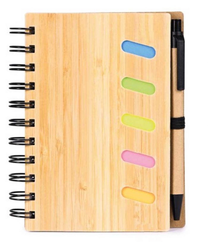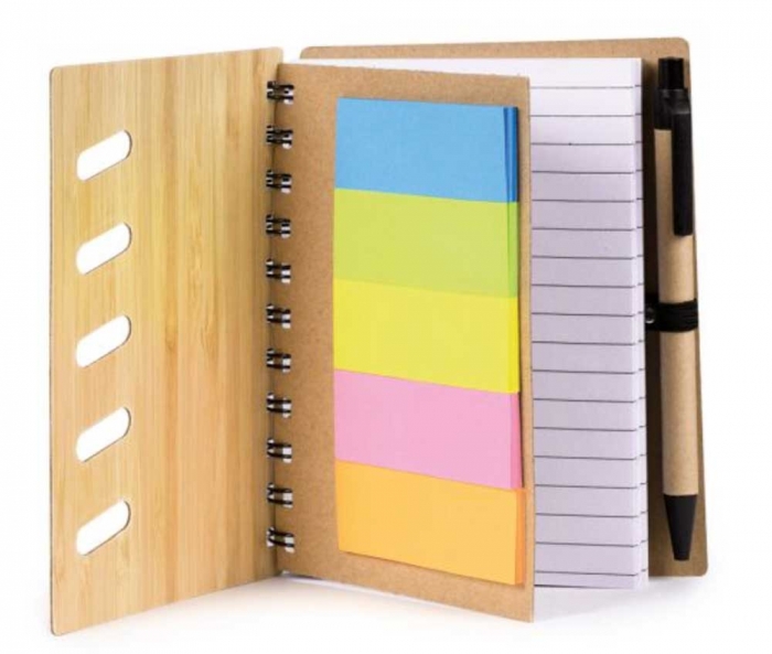 Art. PB002Y Block notes con fogli a righe (60 fogli) e segnalibri adesivi, con penna a sfera in carta riciclato e plastica riciclata. Parte frontale rigida in bambù.