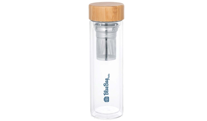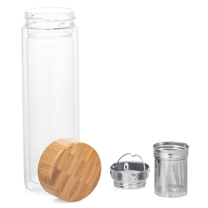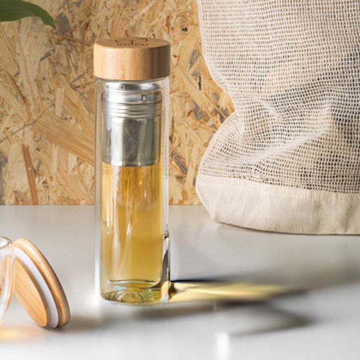 Art. HD05876 Borraccia in vetro borosilicato a doppio corpo con tappo in bambù. Ha una capacità di 490 mL fornita di 2 infusori in acciaio inossidabile. Adatta per lavastoviglie, senza il tappo. Confezionata in una scatola di carta kraft. Poiché il prodotto è realizzato con materiali naturali, il colore del prodotto e il risultato della stampa possono variare da un prodotto all'altro.
