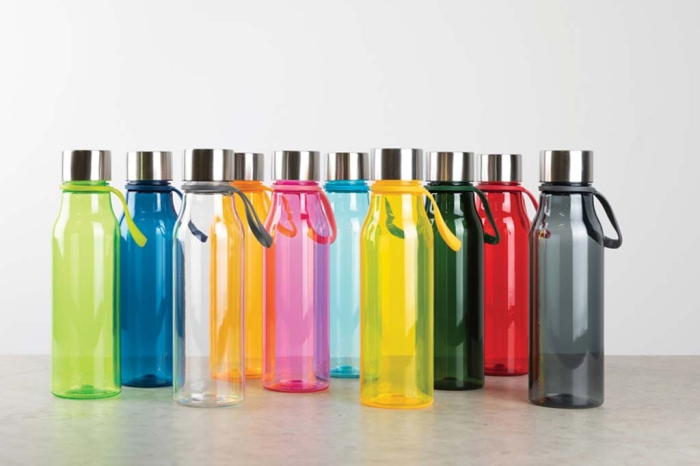 Art. GV61942 Borracce in tritan trasparenti colorate senza BPA. Dotata di passante sul coperchio per il trasporto. Facile da pulire. Ideale per essere personalizzata. Ha una capacita di 600 ml. Chiusura anti goccia con tappoa vite.