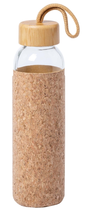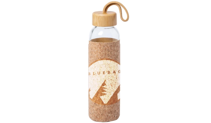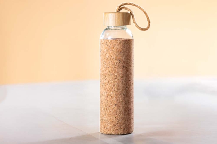 Art. AP832095 Borraccia in vetro, con rivestimento in sughero naturale e tappo in bambù. Non adatta per l'utilizzo con bevande gassate. Ha una capacità di 500mL.