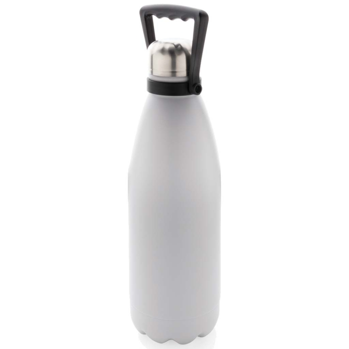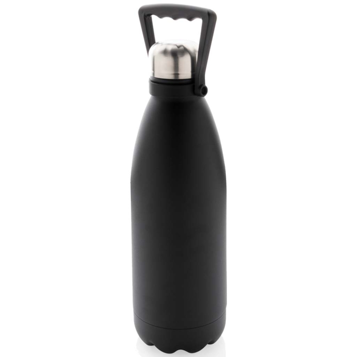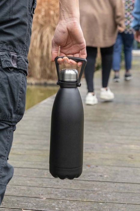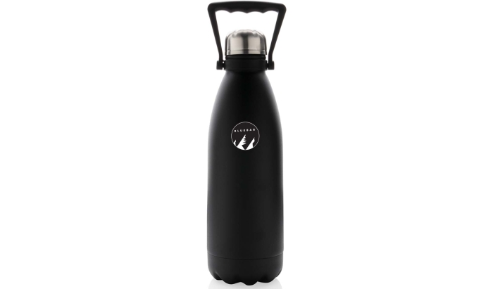 Art. X435-51 Borraccia in acciaio inossidabile a doppia parete. Mantiene le tue bevande calde per 5 ore o fredde per 15 ore. Comoda maniglia per facilitare il trasporto. Realizzata con materiali riciclati. Senza BPA. Confezionata in scatola certificata FSC®.