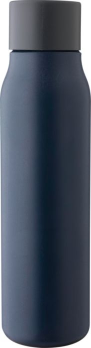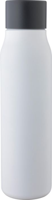 Art. GV2313801 Borracce sostenibili in acciaio riciclato con moschettone. Interno inox 304, esterno inox 201. Ha una capacità di 600 ml. Presenta un tappo nero in PP con gancio in alluminio e anello per il trasporto. Mantiene le bevande calde per 6 ore o fredde per 9 ore, include il logo “acciaio inox riciclato” sulla borraccia, confezionata singolarmente in una scatola in cartone avana.