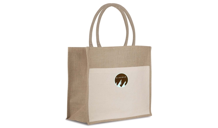 Art. PB35972 Borsa shopper realizzata in iuta e cotone, la borsa presenta una tasca esterna in cotone di colore naturale e manici corti, garantendo un design funzionale e alla moda. Questo articolo è personalizzabile con stampa serigrafica per loghi a tinte piatte o trasferimento termico per loghi multicolore.