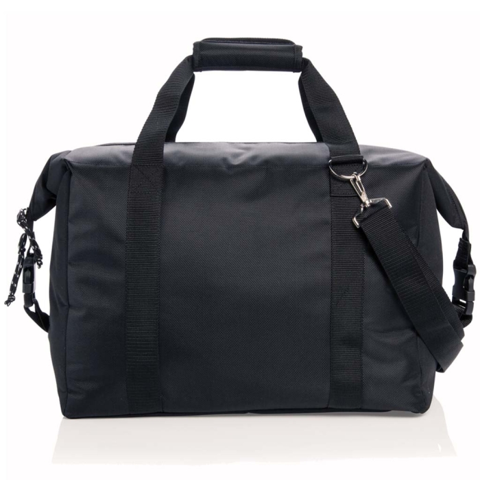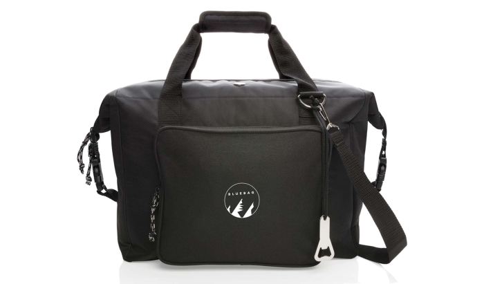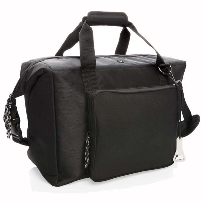 Art. X422-03 Borsa termica in poliestere con scomparto principale extra large, cerniera e tascone frontale sempre con cerniera. Scomparto da 40L, può portare fino a 10 bottiglie da 1,5 L o 52 lattine. Doppio manico rinforzato. Tracolla removibile e regolabile. Include un cavatappi. Isolante in PEVA.
