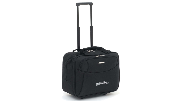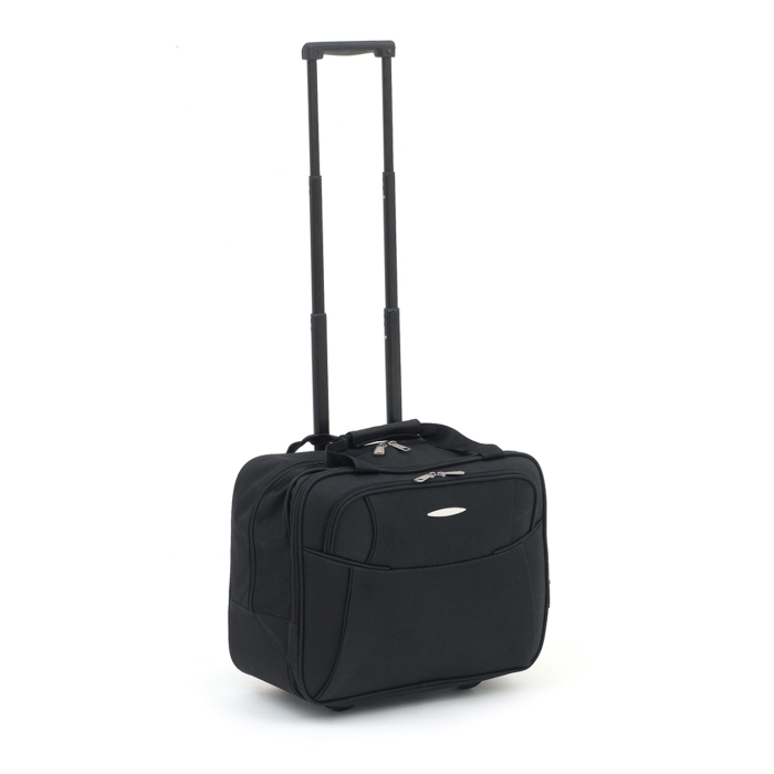 Art. GT77135 Trolley da viaggio, dimensioni bagaglio a mano, realizzato in poliestere 600D. Dotato di due ruote, diversi scomparti, di cui uno imbottito per un laptop di 17 pollici. Manici rinforzati e maniglia telescopica.