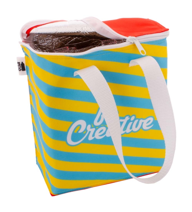 Art. AP827737 Borse shopper frigo per sublimazione, realizzata in poliestere 600D RPET personalizzabile con grafica stampata in sublimazione su tutta la superficie; contiene sino a 6 lattine in alluminio da 0,33 litri. Chiusura con cerniera, imbottitura ed etichetta RPET.