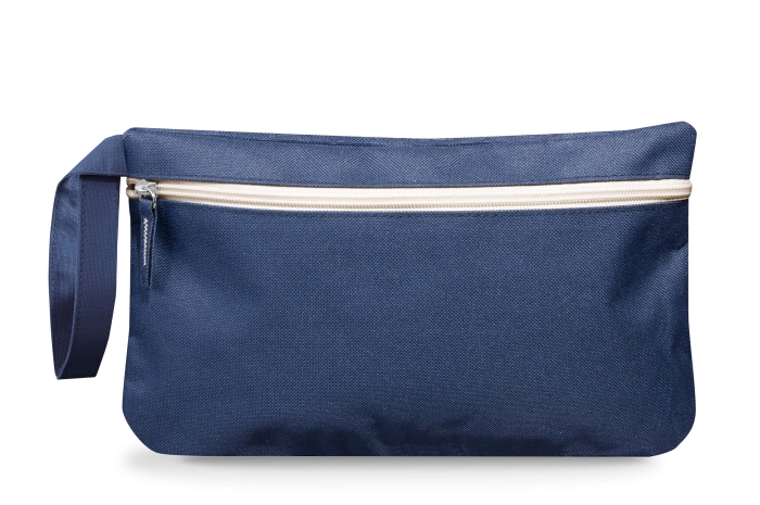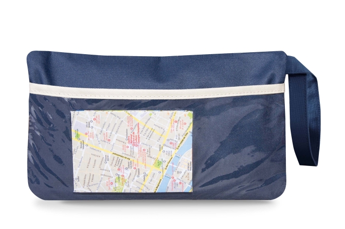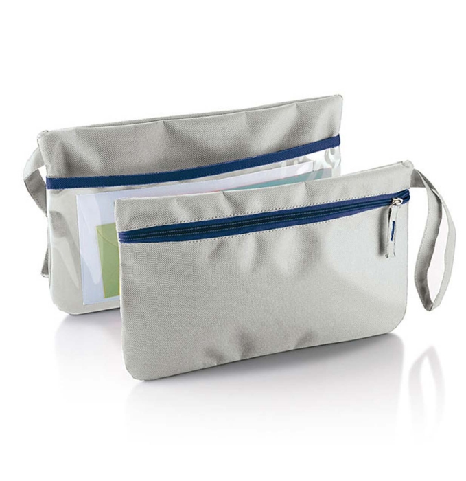 Art. GM24905M Busta porta documenti da viaggio in tessuto con impugnature in contrasto, chiusura a zip, maniglia laterale e tasca esterna trasparente aperta. Comodo per riporre biglietti aerei, prenotazioni, e tutti i documenti a portata di mano. Può essere personalizzato con logo con stampa serigrafica.