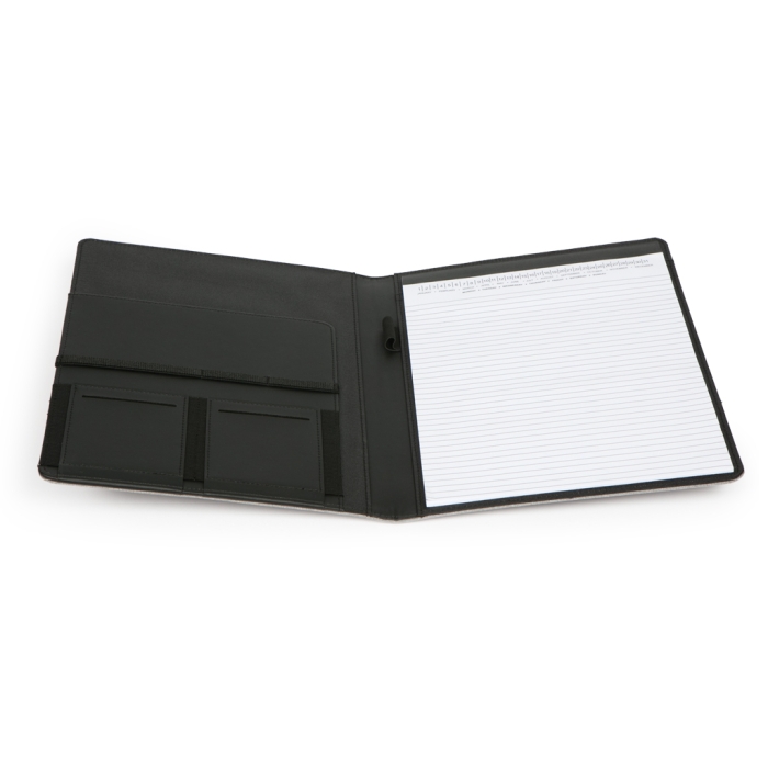 Art. PB35227 Cartella porta blocco con dorso in materiale plastico. Dotata al suo esterno da una placca in metallo personalizzabile. Al suo interno ampio organizer e blocco appunti.