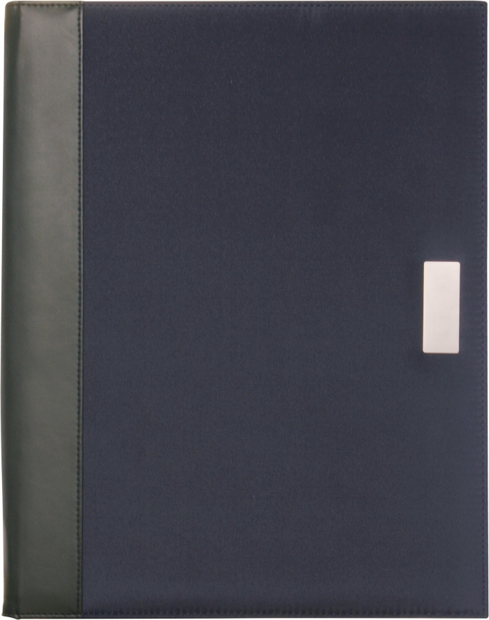 Art. PB45Y Cartella porta blocco con dorso in materiale plastico. Dotata al suo esterno da una placca in metallo personalizzabile. Al suo interno ampio organizer e blocco appunti.