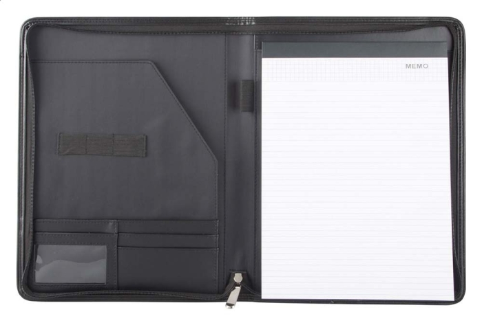 Art. AP910564 Portablocchi business personalizzati dal design elegante e professionale. In formato A4 realizzati in pelle PU, con blocco da 20 fogli a righe incluso. Inoltre presenta al suo interno, portapenne, porta biglietti da visita e chiusura a zip.