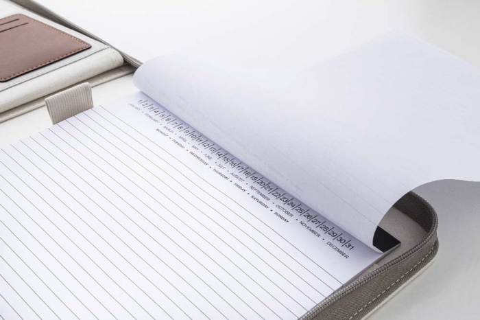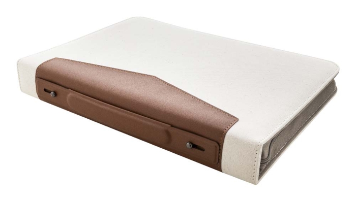 Art. AP919307 Cartella portablocco in formato A4, realizzata in canvas riciclato e pelle PU riciclata, pratica impugnatura, molteplici scomparti interni e blocco note da 20 fogli in carta riciclata a righe.