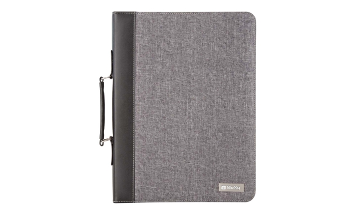 Art. AP910573 Cartella formato A4, con copertina in lino e PU, maniglia, blocco da 20 fogli a righe, calcolatrice a energia solare, piastra in metallo e chiusura con zip.