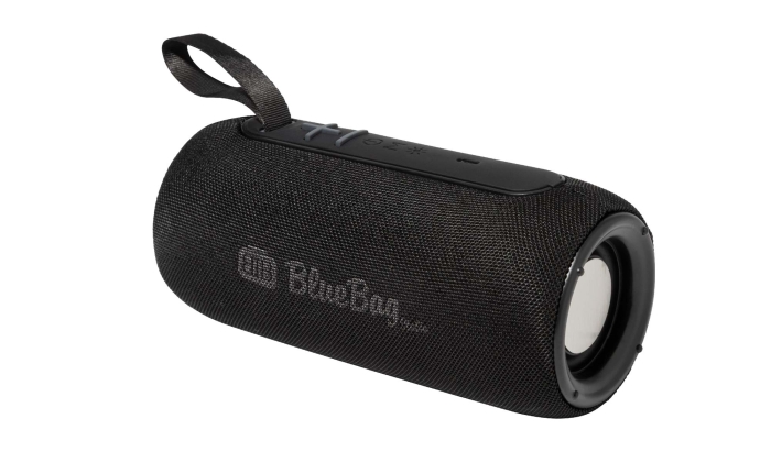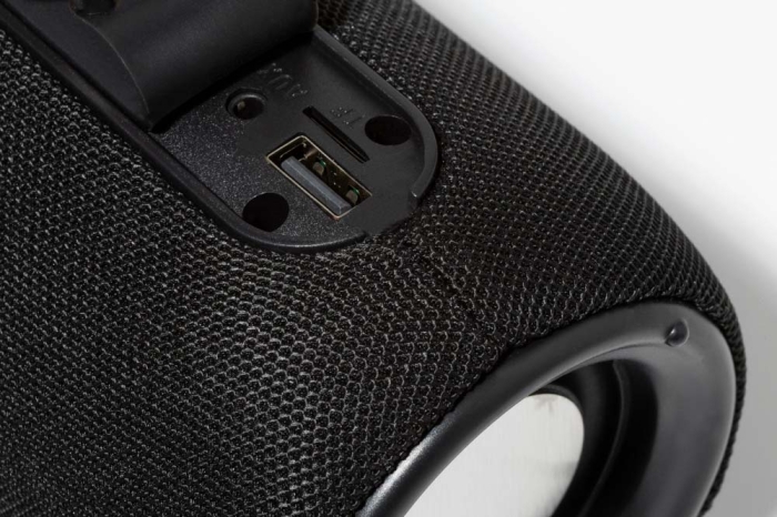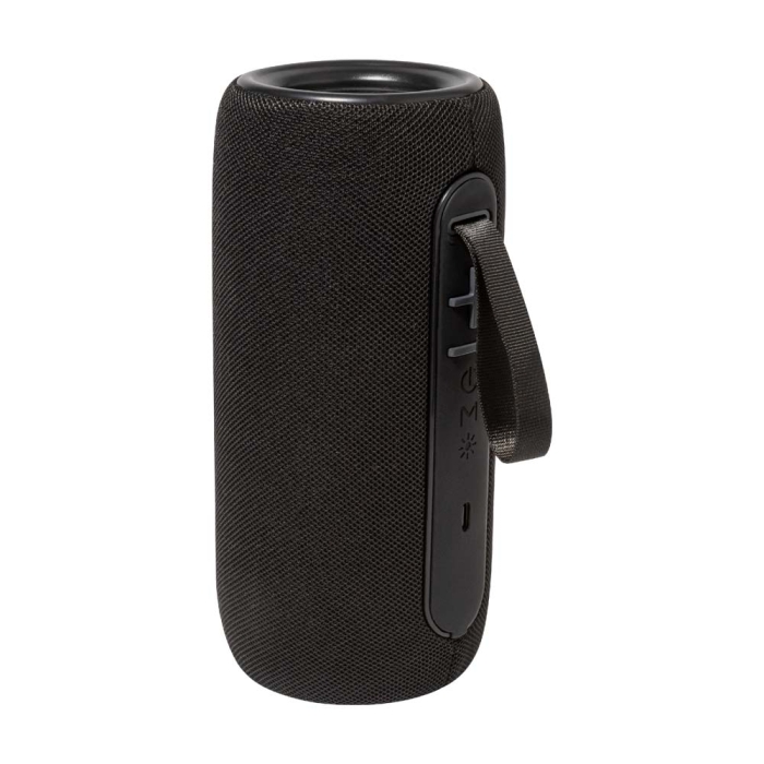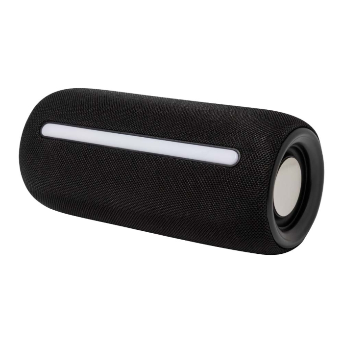 Art. AP975102 Cassa wireless rivestito in tessuto di poliestere con luce LED multicolore e cinghia di trasporto. Con 2 altoparlanti, funzione di chiamata in vivavoce e batteria ricaricabile integrata (1200 mAh). Cavo di ricarica USB incluso.