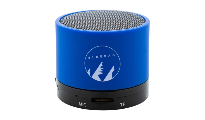 Art. AP975222 Cassa wireless in ABS riciclato con corpo gommato, rete metallica e batteria ricaricabile (300 mAh). Con funzione di chiamata in vivavoce e riproduzione di MP3 su micro SD. Cavo di ricarica USB incluso.