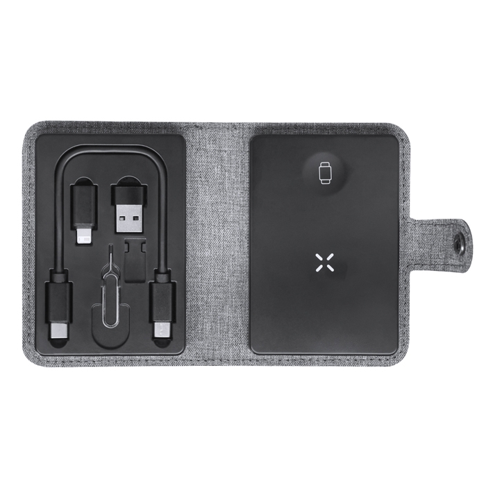 Art. GM32434KT Base di ricarica completa di cavetti e adattatori realizzata in 300D RPET. Custodia compatta con chiusura a bottone e dock di ricarica wireless Qi per i tuoi dispositivi. Fornito con cavo di connessione Type-C ad entrambe le estremità, più adattatori USB e lightning/micro USB. Estrattore di schede SIM e un vano per riporre una scheda Micro SIM. Con logo RPET.
