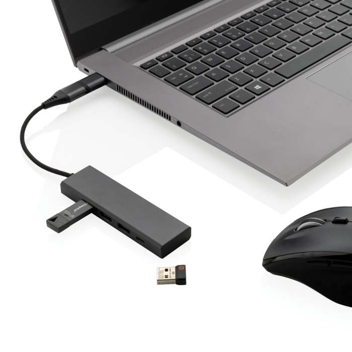 Art. X308-68 Hub USB in alluminio riciclato certificato RCS, ABS, TPE e PET. Con 3 porte USB A 2.0 e 1 porta type C. L'HUB ha un cavo integrato da 10 cm realizzato con materiale TPE/PET riciclato certificato RCS. Articolo e accessori non contengono PVC. Confezionato in scatola FSC.