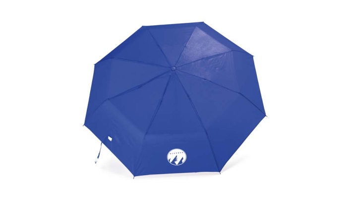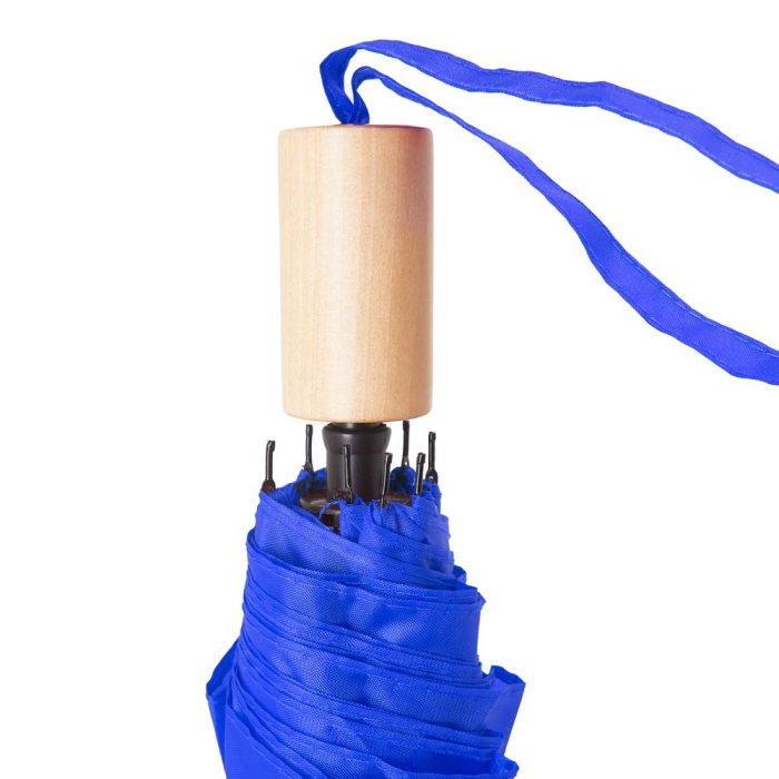 Art. ST6721 Ombrello pieghevole RPET con copertura coordinata. Canna, costole ed estremità in nero. Manico in legno naturale. Chiusura in velcro e apertura manuale.