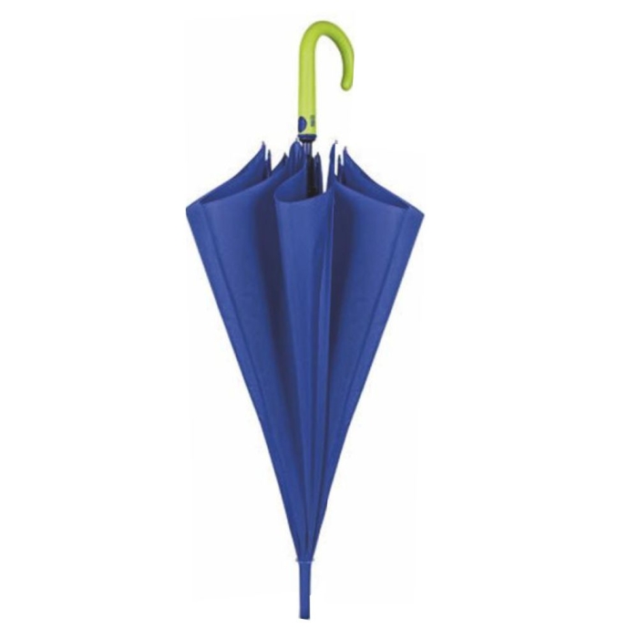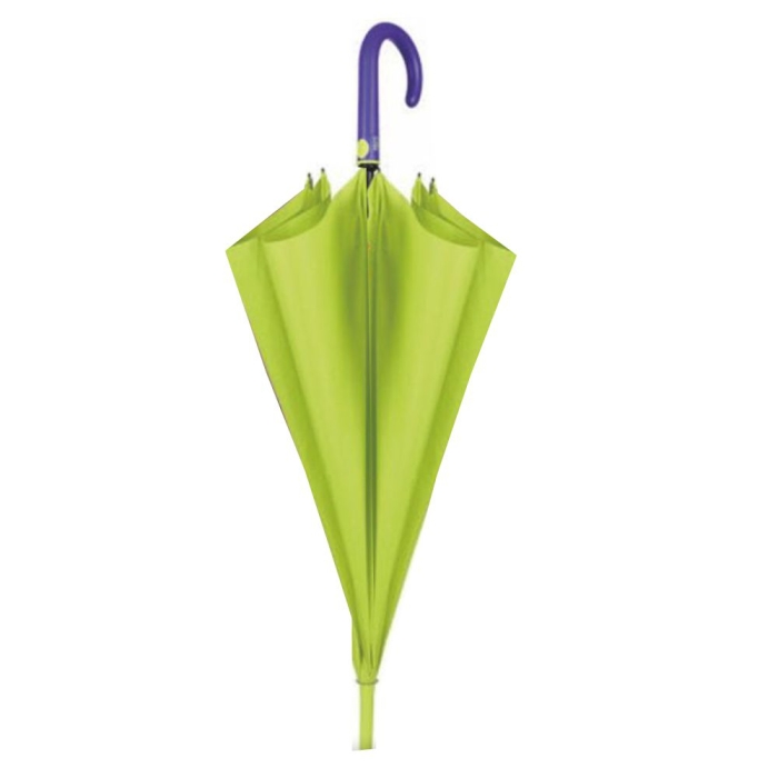 Art. SA1027 Ombrelli bicolore promozionali a scatto automatico, realizzato in poliestere 190T. Manico curvo in gomma colorata, con bottone in contrasto. Stecche in fibra di vetro nero. Asta nera. Puntale plastica colorata. Colori: arancio, rosso, blu, tiffany blu, verde lime, viola.
