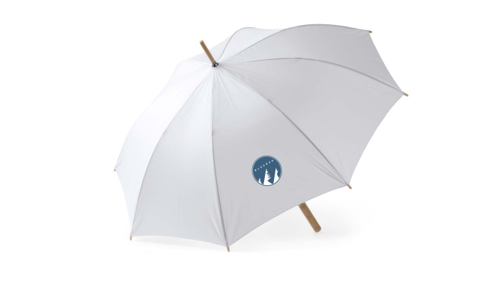 Art. ST2652 Ombrelli personalizzati con manico struttura e dettagli in bambù. Presenta apertura automatica e tessuto in pongee antivento 190T RPET. Perfetta per proteggersi con stile e sostenibilità.