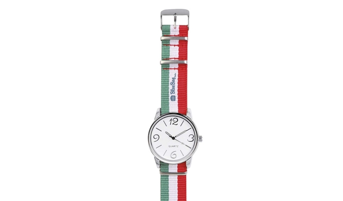 Art. PB21126 Orologi da polso cinturino colori bandiera in metallo e nylon. Cassa in metallo e il movimento Miyota 2035 garantiscono precisione e durata, mentre il cinturino in nylon offre comfort e resistenza. È personalizzabile con stampa digitale per colori vividi, stampa tampografica per loghi a tinte piatte, o incisione laser per dettagli ad alta precisione.