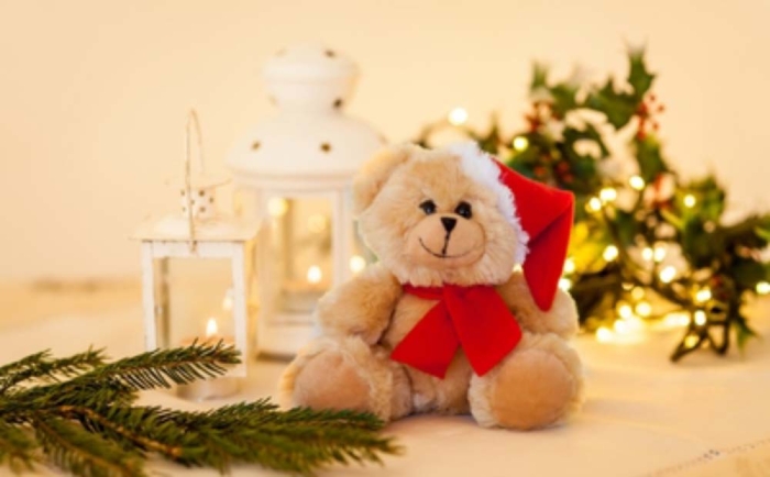 Art. FF302-67 Orsacchiotto con cappellino e sciarpa da Babbo Natale, personalizzabile su entrambi gli accessori.