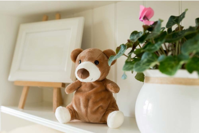 Art. FF951-27 Orsacchiotto con pancia adatta alla stampa, piccole perline all'interno aiutano a mantenere l'equilibrio in posizione seduta, prodotto in peluche.