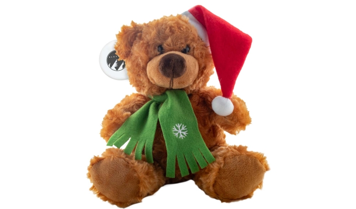 Art. AP900119 Peluche orsetto di Natale con cappello e sciarpa di Babbo Natale. Dispone di targhetta in carta per la personalizzazione da appendere all'orecchio.