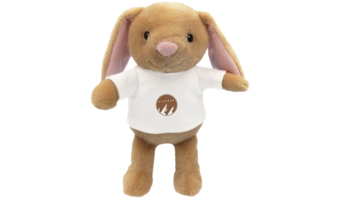 Art. FF802-29 Coniglietto con maglietta bianca adatta alla stampa. Realizzata in peluche ricavato da bottiglie in PET riciclate, conforme alla certificazione GRS (Global Recycled Standard).