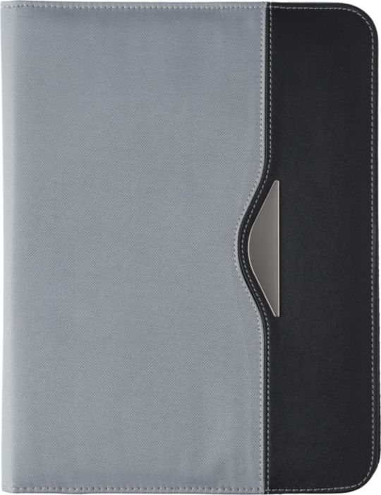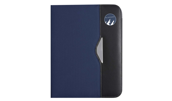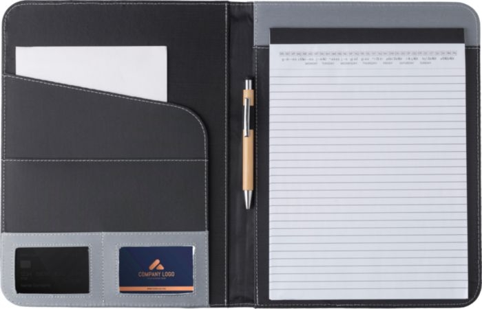 Art. GV9779 Portablocco formato A4, presenta uno scomparto grande sul lato sinistro, un vano portabiglietti, passante elasticizzato per penna, una targhetta in metallo personalizzabile. Il blocco è incluso.