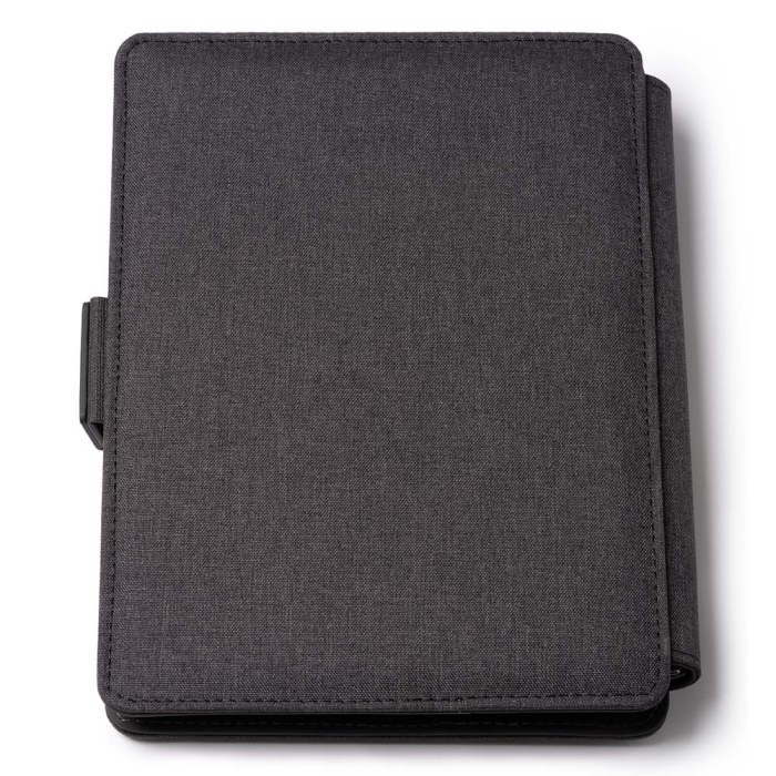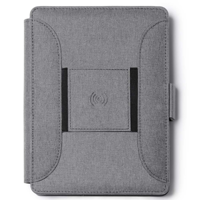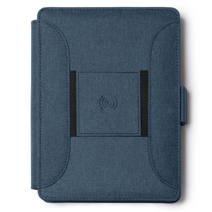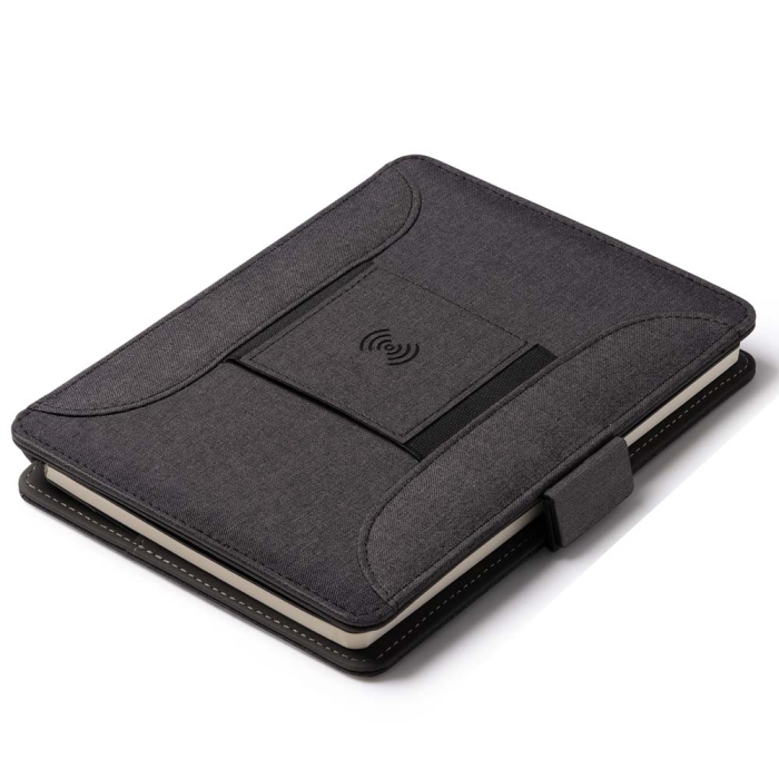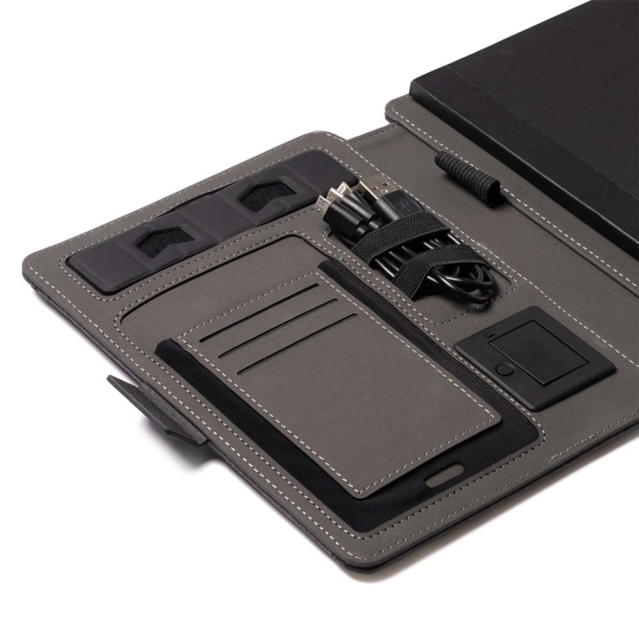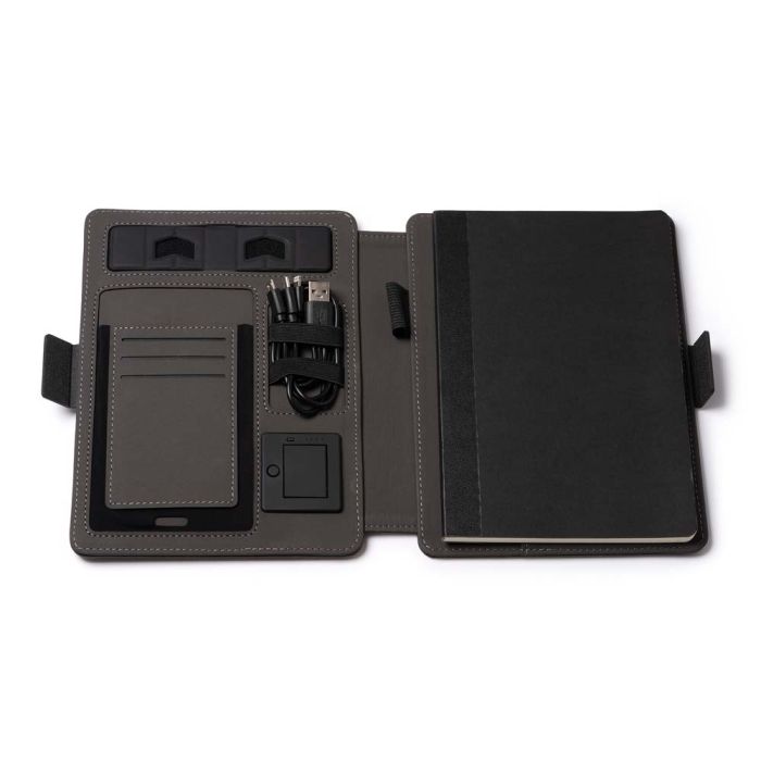 Art. ST2295 Cartellina multifunzione A5 RPET 300D. Dotata di chiusura magnetica, è dotata di un caricabatterie wireless integrato nella copertura incluso un cavo con 3 ingressi (tipo C e uscita USB) che consente di caricare diversi dispositivi, con la ricarica wireless. All'interno presenta un blocco note rimovibile con 56 fogli e uno scomparto per il vostro cellulare, dove potrete tenerlo a portata di mano e protetto. Include anche un portacarte e un portacellulare, portapenne.