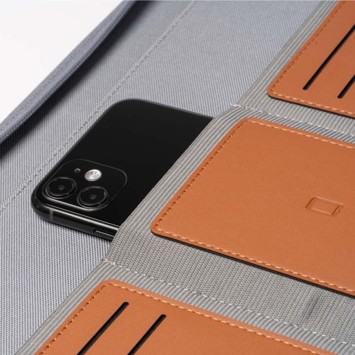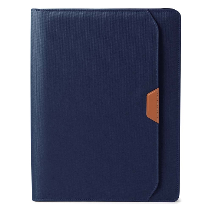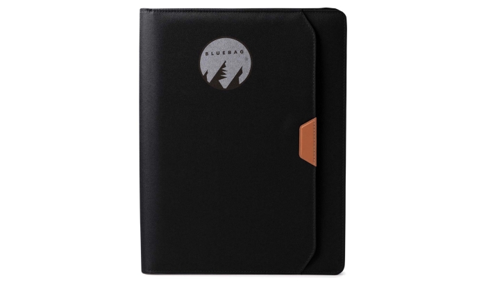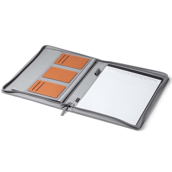 Art. ST2931 Portablocco in formato A4 realizzato in RPET 600D e PU con cerniera. Dispone di una tasca esterna, diversi scomparti interni e 4 spazi per le tessere. Include un portapenne. Quaderno a righe con 20 fogli rimovibili.
