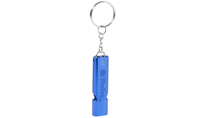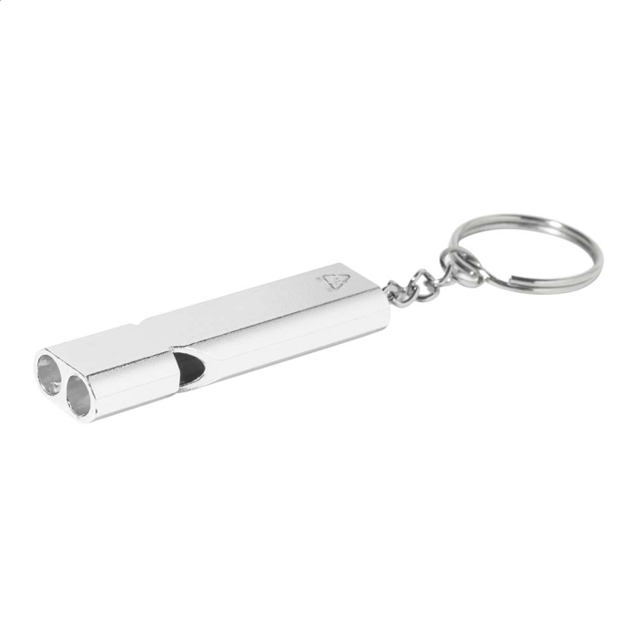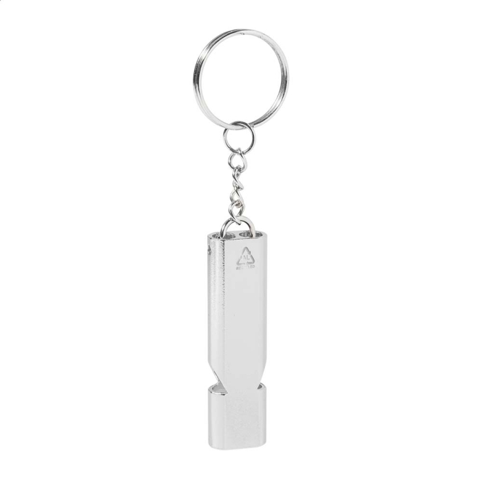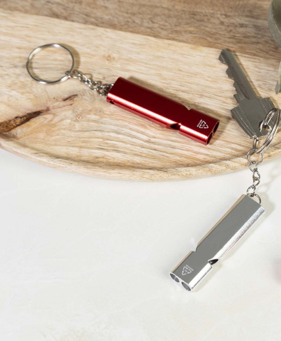 Art. AP911377 Portachiavi a forma di fischietto. Realizzato in alluminio riciclato con portachiavi in metallo.