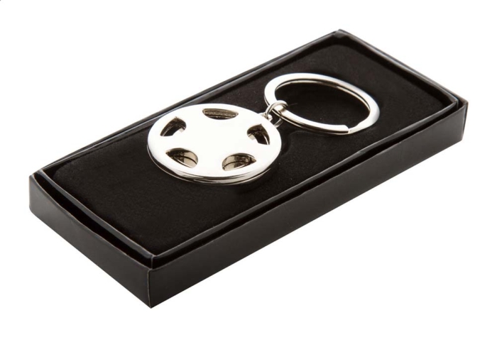 Art. AP921847 Portachiavi in metallo a forma di cerchione d'auto con gettone per il carrello della spesa, in scatola regalo nera.