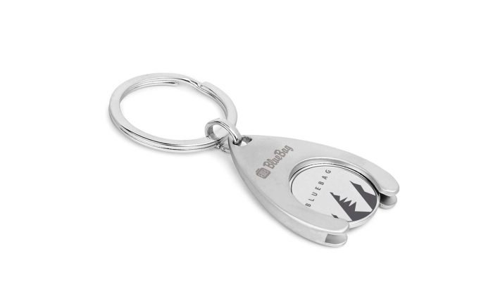 Art. HD04400 Portachiavi in metallo con gettone per carrello della spesa. Fornito in confezione regalo. 3,2 x 4 cm e moneta: ø2,4 cm.