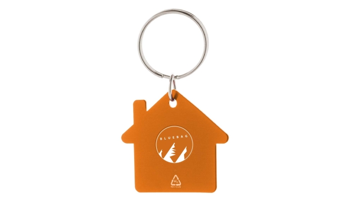 Art. AP911215 Portachiavi in alluminio riciclato a forma di casa con anello in metallo.