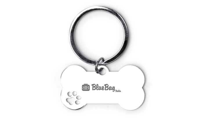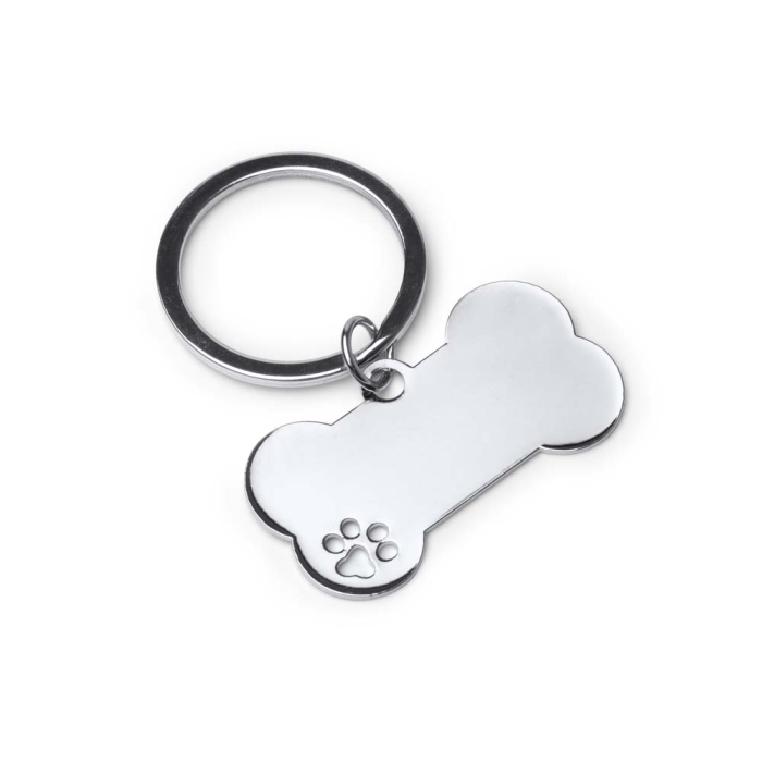 Art. ST2013 Portachiavi a forma di osso realizzato in metallo 201. Presenta un dettaglio a forma di zampa.