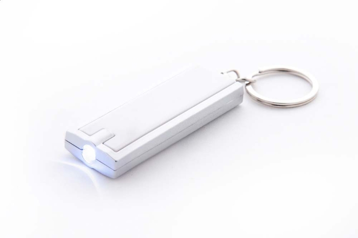 Art. AP975106 Portachiavi in ABS riciclato con torcia LED e portachiavi in metallo. Fornito di batterie a bottone.