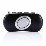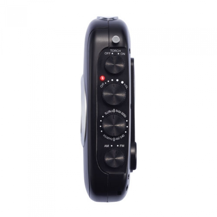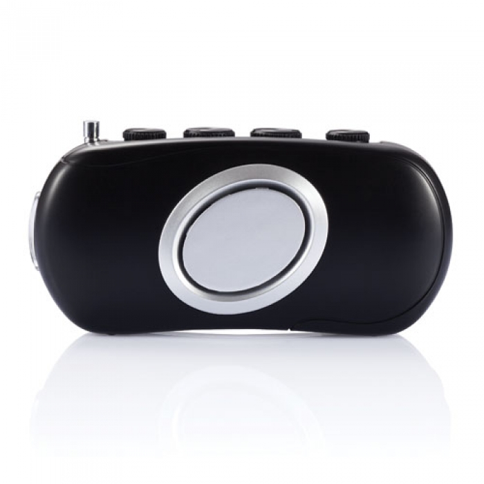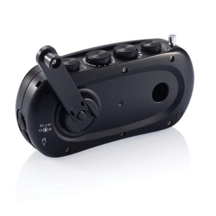 Art. 32661 Radio con carica manuale. Ruotando la manovella per 90 secondi si avrà un´autonomia di 20 minuti. In caso di emergenza può essere usata come torcia. Dimensioni: 3 x 13,5 x 7 cm