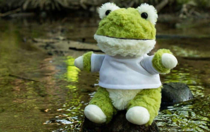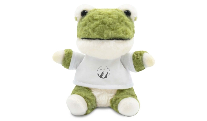 Art. FF939-17 Peluche a Forma di rana personalizzati con T-shirt bianca adatta alla stampa. La T-shirt senza stampa confezionato separatamente. Se stampata verrà consegnato indossato sul peluche.
