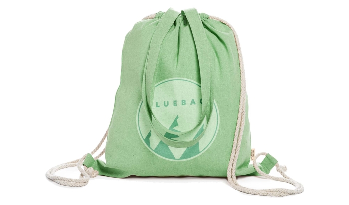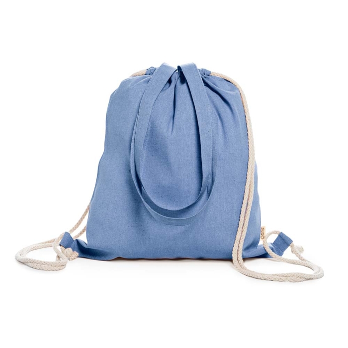 Art. ST8218 Borsa zaino con coulisse. Realizzata 100% cotone riciclato 140 g/m² in finitura marmorizzata con manici coordinati lunghi 70 cm e lacci color naturale.