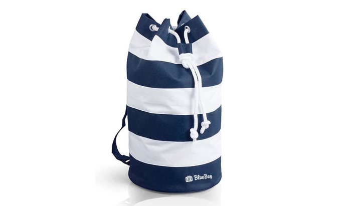 Art. GM28174 Sacche da spiaggia economiche, comoda e capiente. Dal design moderno a strisce bicolore, estivo e leggero. Realizzata in poliestere 600D presenta spallacci regolabili in nastro e chiusura a strozzo.