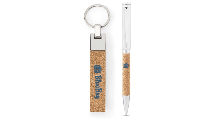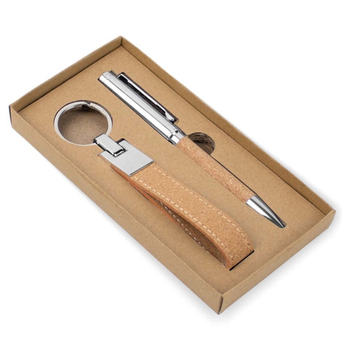 Art. HD06217 Set portachiavi e penna in sughero promozionale, entrambi in metallo e sughero. La penna a sfera è composta da una clip in metallo, un meccanismo a rotazione e un inchiostro blu. Fornito in una confezione regalo in carta kraft. Penna a sfera: ø1,1 x 13,7 Cm. Scatola 16 x 1,7 Cm.