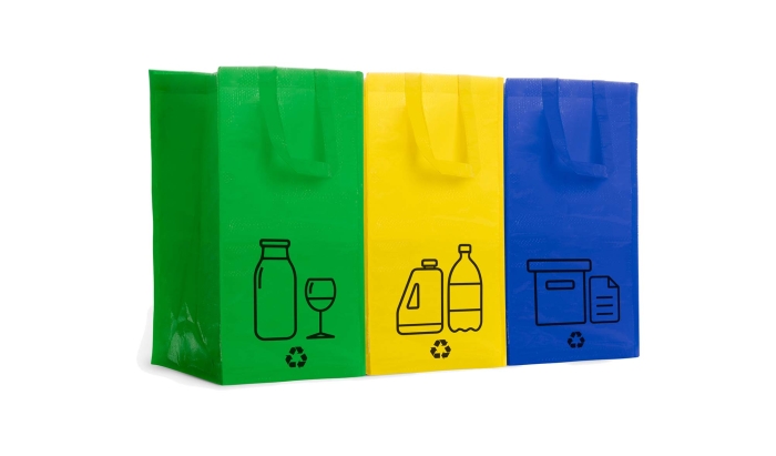 Art. ST8258 Set di 3 sacchetti per la raccolta differenziata realizzati in resistente tessuto pp laminato con velcro laterale e manici rinforzati.