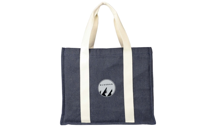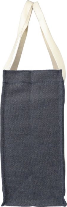 Art. GV2283427 Elegante shopper in Denim (Jeans) 280 g/m2 realizzato in 65% poliestere e 35% cotone. Presenta soffietti da 15 cm, manici lunghi in tela 280 g/m2. Chiusura a bottone.