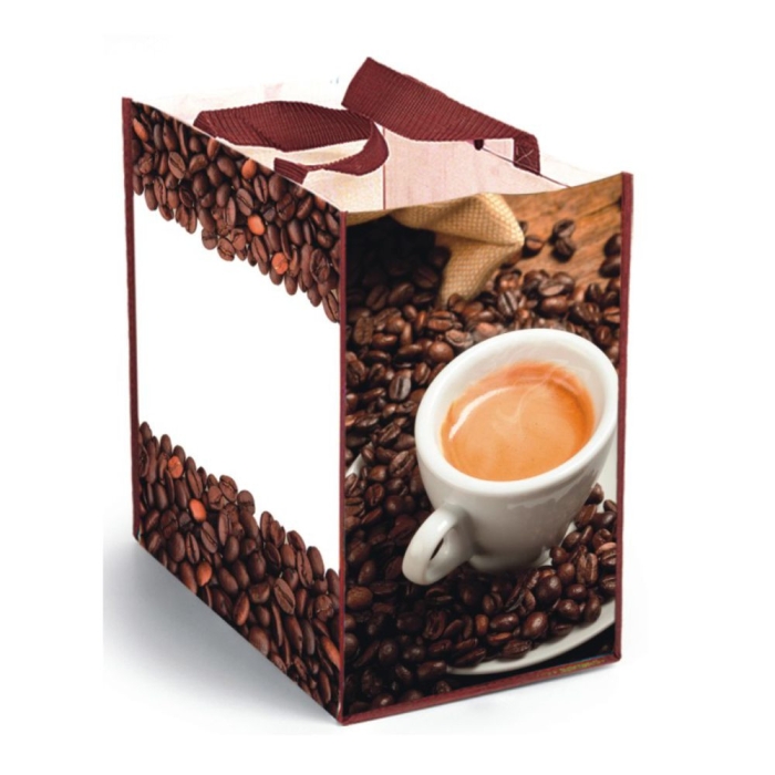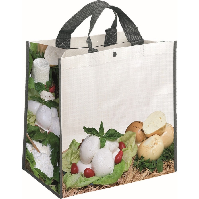 Art. SA1072 Borsa shopping PP con fantasie alimentari, doppio manico. Chiusura con bottoncino. Colore unico. Possibilità di personalizzare questa borsa in serigrafia.